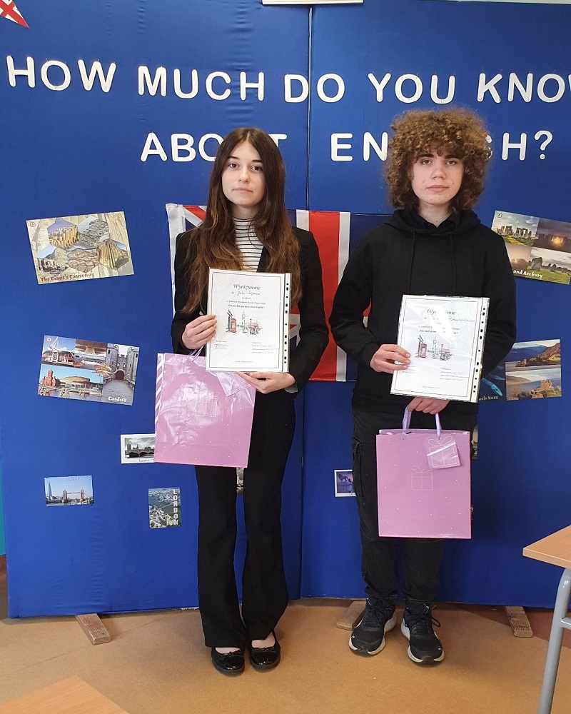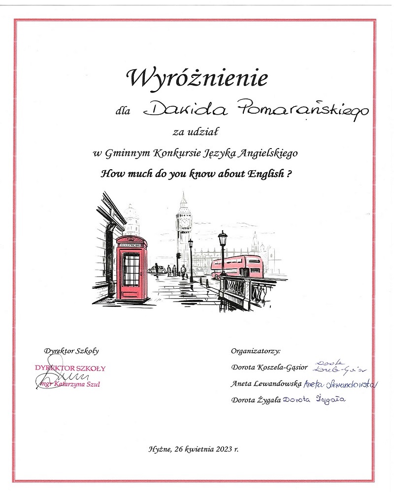 26 kwietnia 2023 r. odbył się Gminny Konkurs Języka Angielskiego „How much do you know about English?” zorganizowany w Szkole Podstawowej w Hyżnem. Wzięło w nim udział 18 uczniów z klas 7 i 8 wszystkich szkół podstawowych terenu gminy Hyżne. Konkurs obejmował zagadnienia leksykalne i gramatyczne oraz elementy wiedzy kulturowej Wielkiej Brytanii. Bardzo cieszymy się z sukcesu uczniów naszej szkoły: Dawida Pomarańskiego (kl. 7) i Julii Ząbroń (kl. 8), którzy zdobyli wyróżnienia.