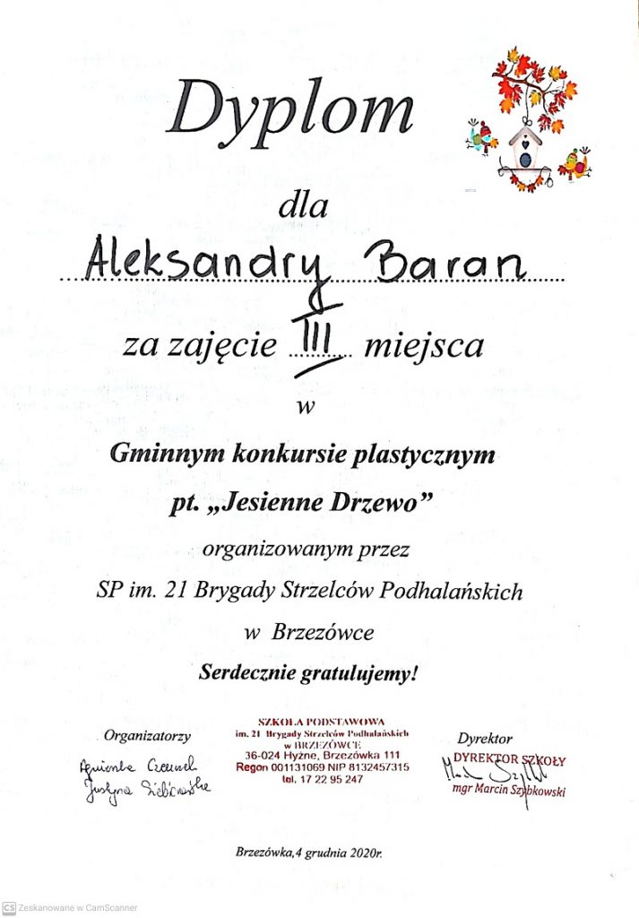 Aleksandra Baran i Hanna Irzyk – uczennice kl. II w miesiącu październiku 2020r. wzięły udział w gminnym konkursie plastycznym „Jesienne drzewo” zorganizowanym przez Szkołę Podstawową w Brzezówce. Celem konkursu było rozwijanie zainteresowań różnorodnymi technikami plastycznymi, rozwijanie uzdolnień plastycznych dzieci, dostrzeganie piękna natury oraz pobudzanie ich wyobraźni i aktywności plastycznej. Ucz. Hanna Irzyk zajęła w konkursie II miejsce a ucz. Aleksandra Baran zajęła III miejsce. Nagrodzone prace konkursowe charakteryzuje kreatywność, pomysłowość i twórcza wyobraźnia naszych uczennic. W konkursie udział wzięły również uczennice: Zuzanna Kiełtyka – kl. I, Maja Filip – kl. III, Maria Janik – kl. III