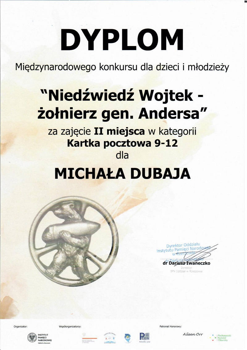 Aktualności 21 czerwca 2021 przez Grzegorz Jeziorski · Published 21 czerwca 2021 Sukces naszego ucznia – Michała Dubaja w międzynarodowym konkursie „Niedźwiedź Wojtek – żołnierz gen. Andersa”