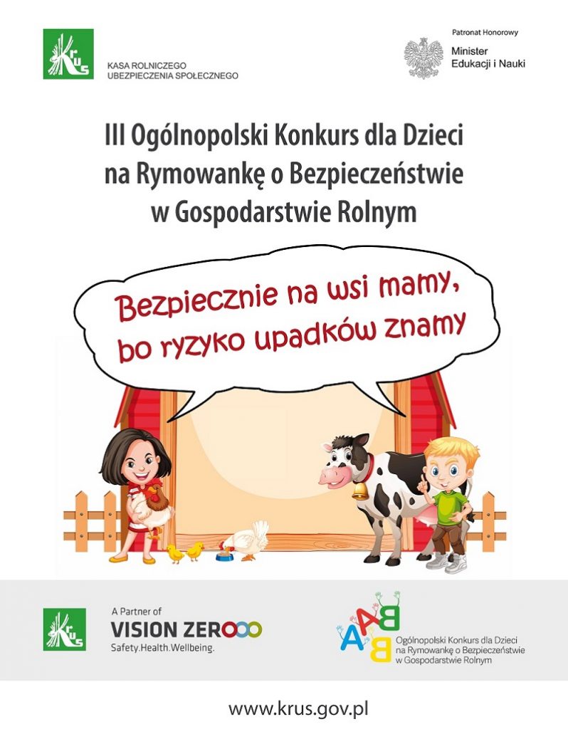 Zapraszamy dzieci rolników ubezpieczonych w KRUS do udziału w III Ogólnopolskim Konkursie dla Dzieci na Rymowankę o Bezpieczeństwie w Gospodarstwie Rolnym pod hasłem „Bezpiecznie na wsi mamy, bo ryzyko upadków znamy”. Patronat Honorowy nad konkursem sprawuje Minister Edukacji i Nauki Przemysław Czarnek.