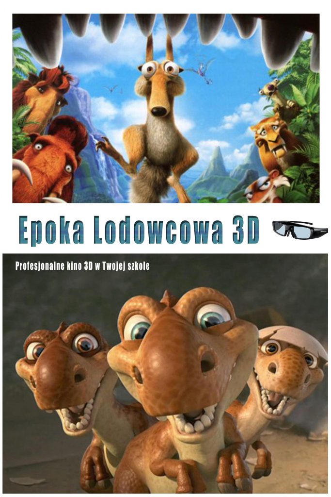 Zapraszamy do udziału w nowym projekcie edukacyjnym 3D, na który składa się seans filmu edukacyjnego na temat epoki lodowcowej oraz świata prehistorycznego. Taki sposób uczestniczenia w seansie aktywizuje uczniów do uważnego oglądania filmu. Dodatkowo uczniowie, dzięki pełnej rywalizacji zabawie, polegającej na odpowiadaniu na ciekawe pytania, zapamiętują więcej informacji z filmu, uczą się aktywnego oglądania oraz analizy. To wszystko, w połączeniu z technologią 3D, składa się na niezapomniane kinowe przeżycie. Wizyta kina cyfrowego stanie się dla uczestników niezwykłą przygodą oraz przyjemną i kreatywną zabawą, która gwarantuje, że uczniowie wrócą do szkolnych ławek pełni entuzjazmu i chęci do poznawania nowych rzeczy.