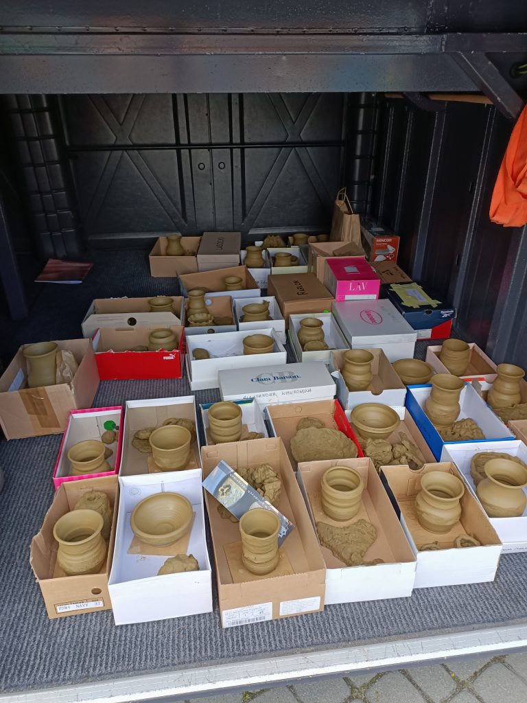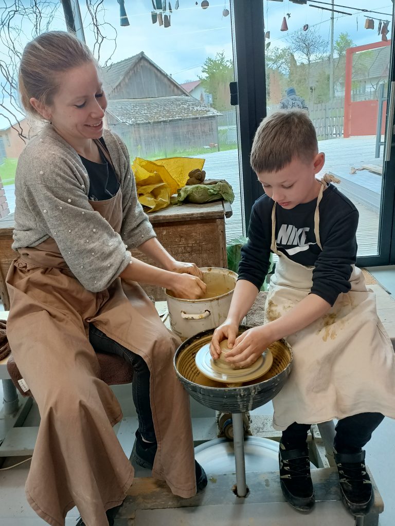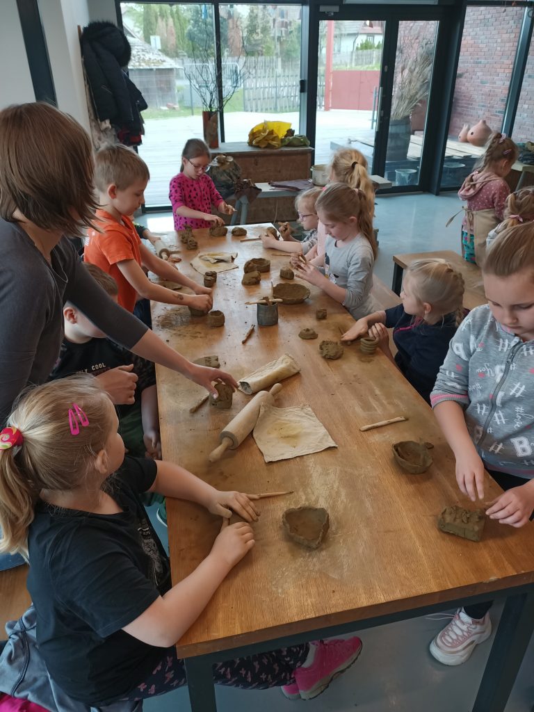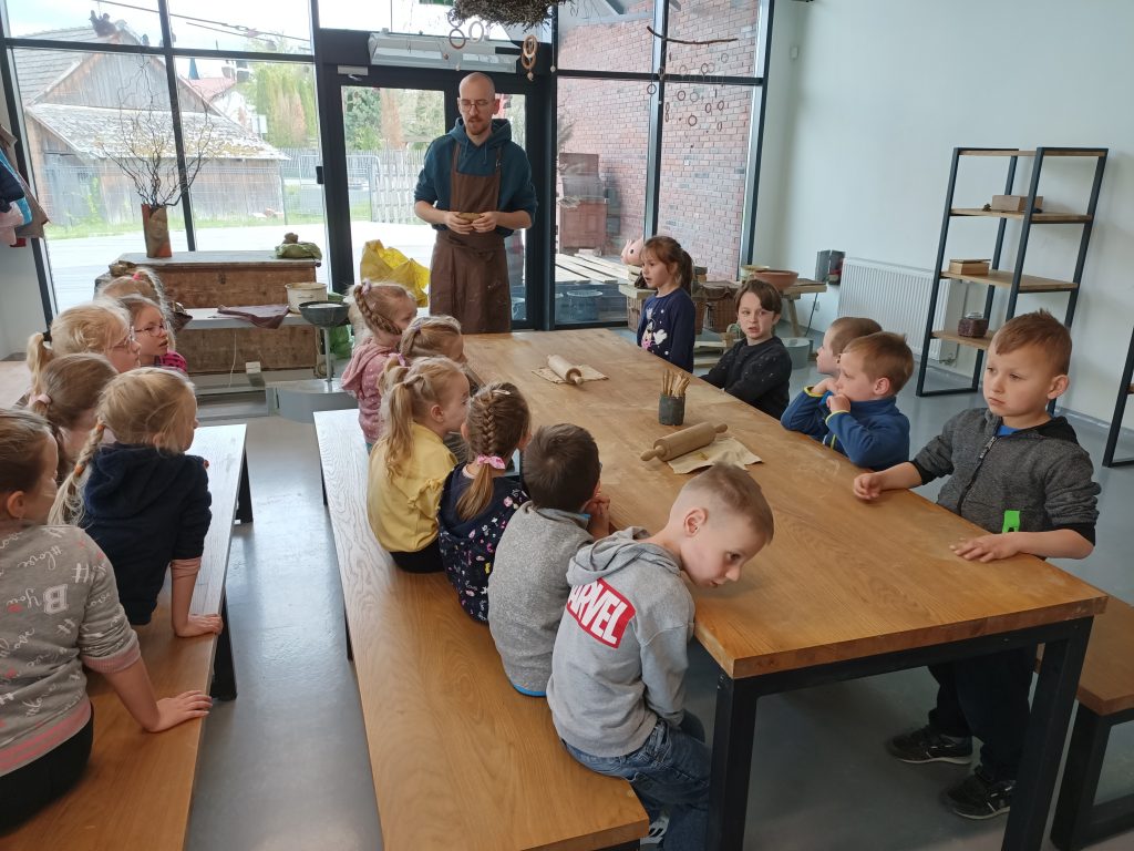 Podczas warsztatów garncarskich poznaliśmy sposób wykonywania glinianych przedmiotów. Każdy uczestnik zajęć z pomocą instruktora miał możliwość wykonać sobie z gliny wazon, flakon lub miseczkę na kole garncarskim. Ponadto każde dziecko z kawałka gliny mogło ulepić lub wyrzeźbić wszystko to, co sobie wymyśliło. Po wszystkich atrakcjach małym wycieczkowiczom bardzo smakował obiad w pobliskiej karczmie. Uwieńczeniem wycieczki był zakup pamiątek wykonanych z wypalanej gliny.