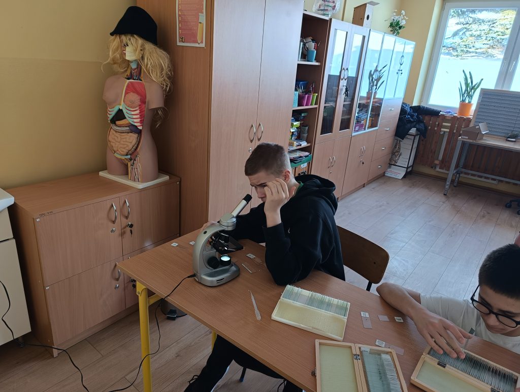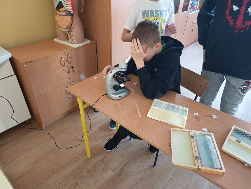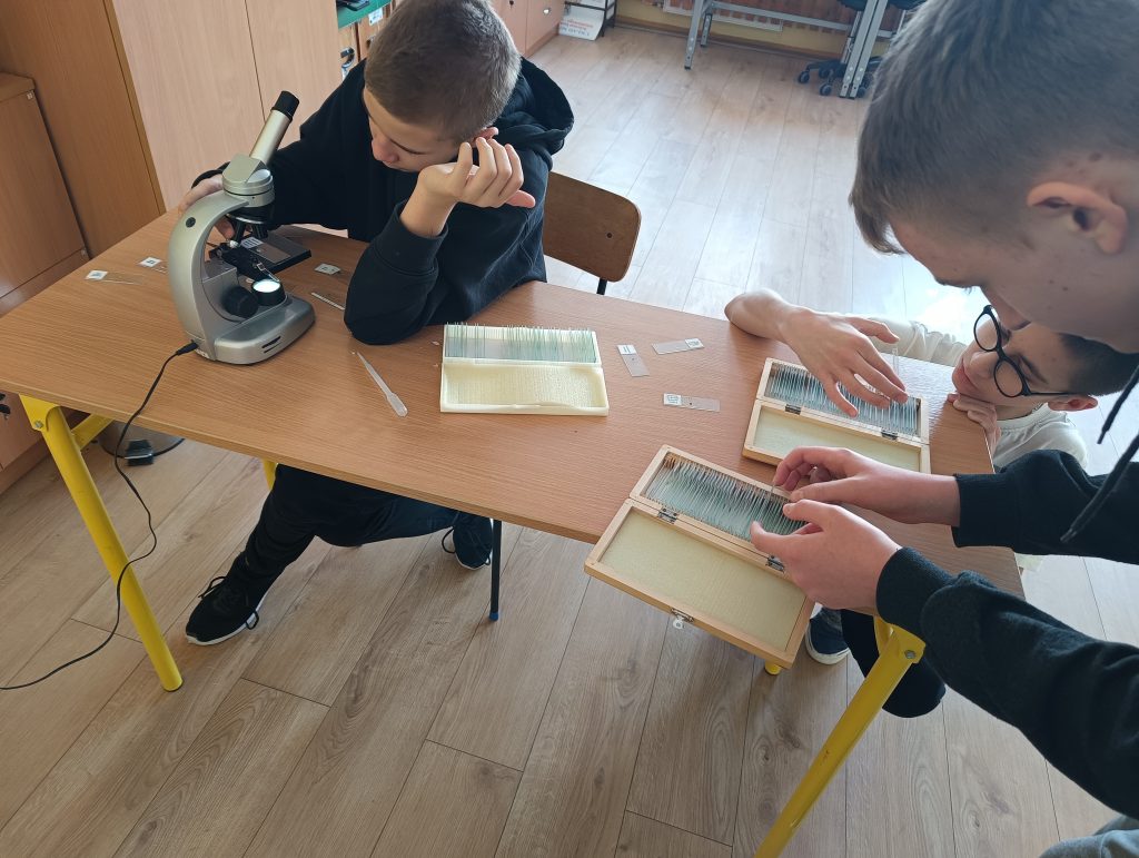 Przekonali się o tym uczniowie klasy V i VI, którzy w ramach utrwalenia wiedzy i umiejętności wykonali modele komórek: roślinnych, zwierzęcych, bakteryjnych i grzybowych oraz przedstawicieli stawonogów. Uczniowie kl. VII przy użyciu mikroskopów przyglądali się człowiekowi z bliska. Udało się nawet stworzyć własny preparat z włosem kolegi Bartka z klasy Był to ciekawy sposób na przypomnienie podczas pracy nazw i znaczenia poszczególnych elementów. Liczymy na to, że zdobyta w ten sposób wiedza zostanie na długo w pamięci.