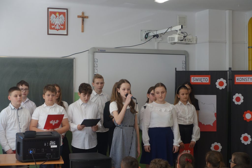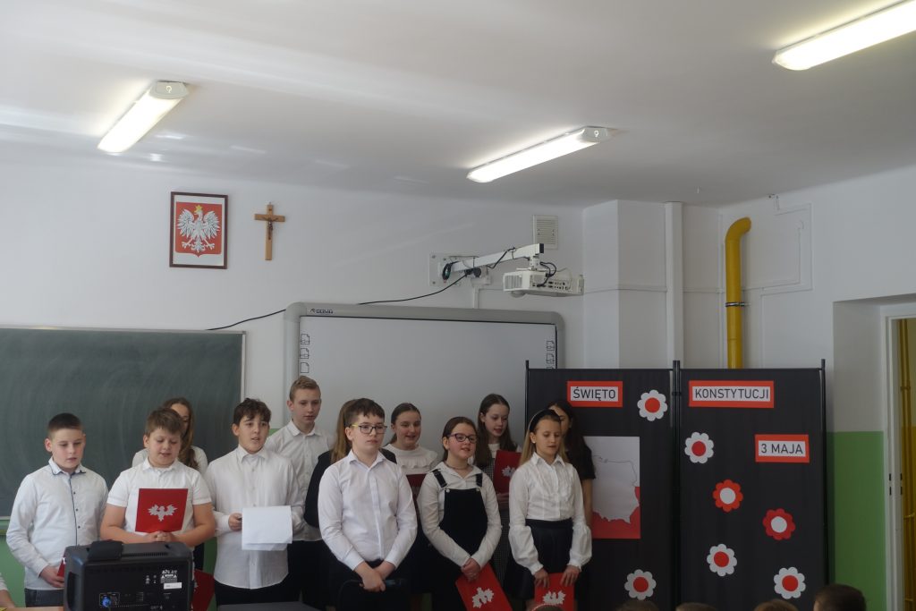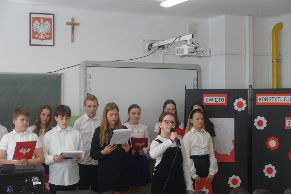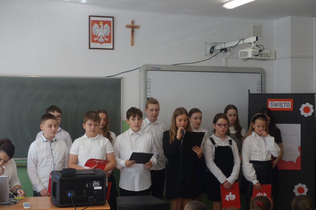 Po uroczystym wprowadzeniu sztandaru szkoły młodzież odśpiewała hymn państwowy. Uczniowie klas trzeciej, czwartej, piątej i szóstej zaprezentowali najważniejsze wydarzenia związane z obchodami tego święta. Całość dopełniły także wiersze o pieśni patriotyczne w wykonaniu uczniów.