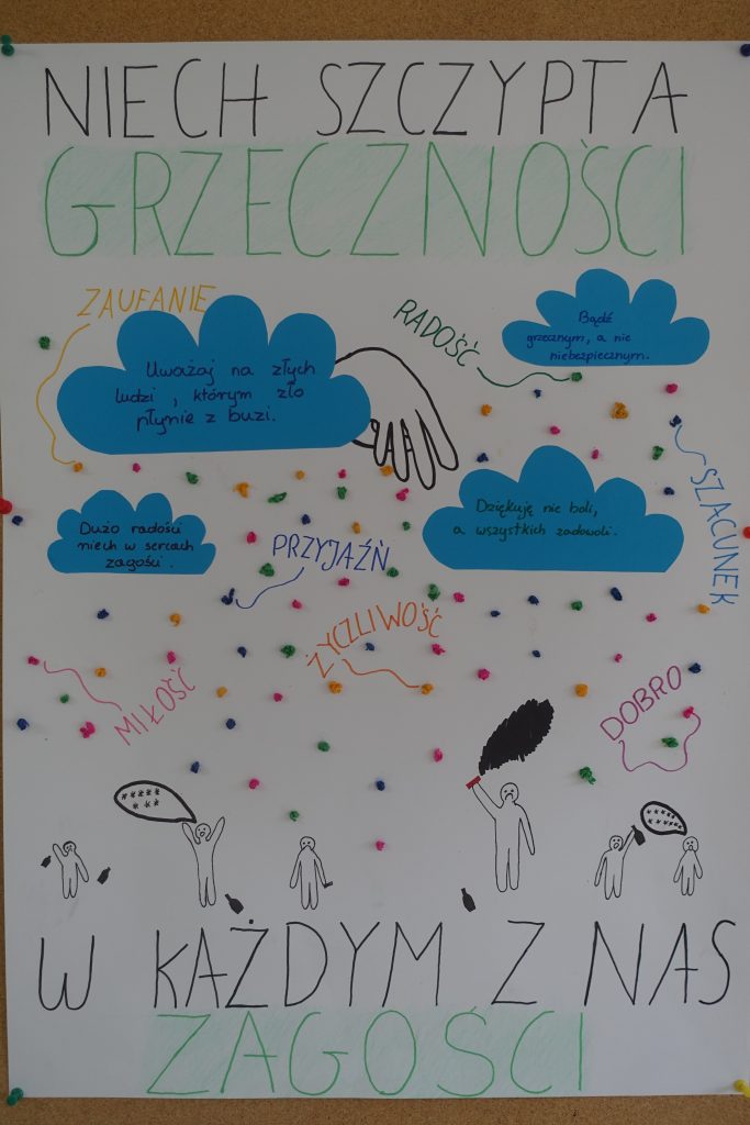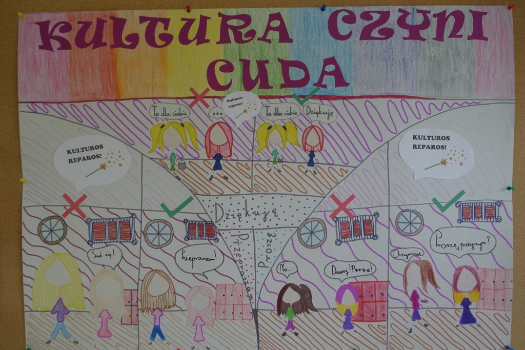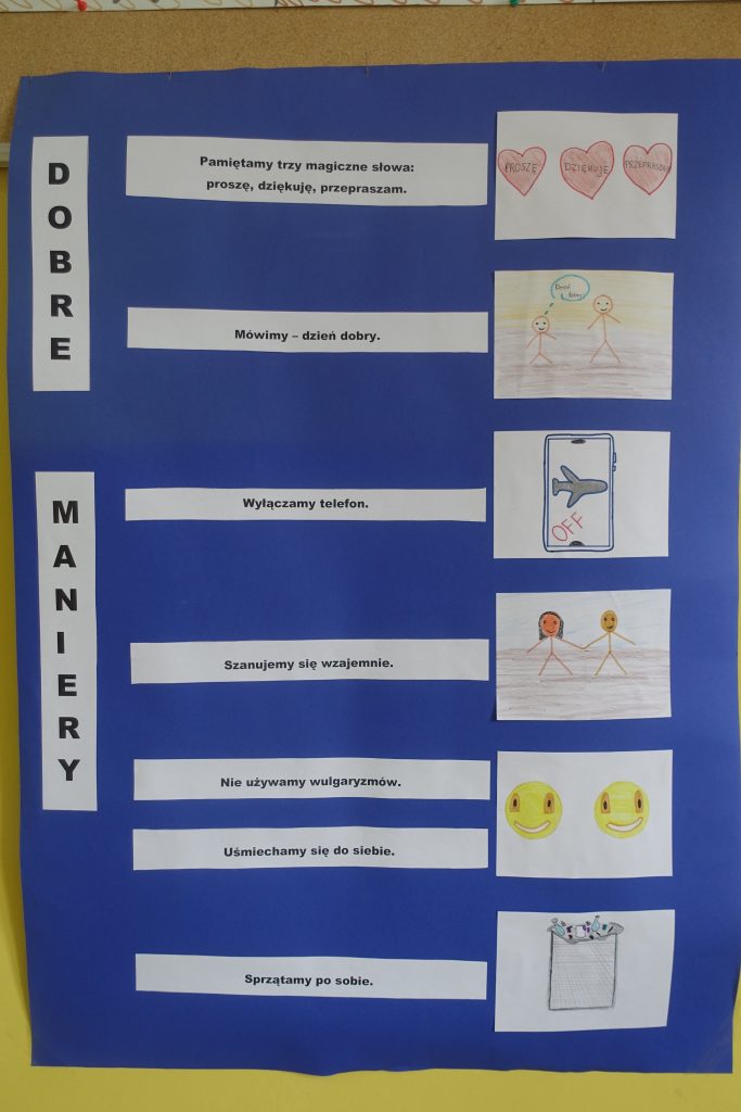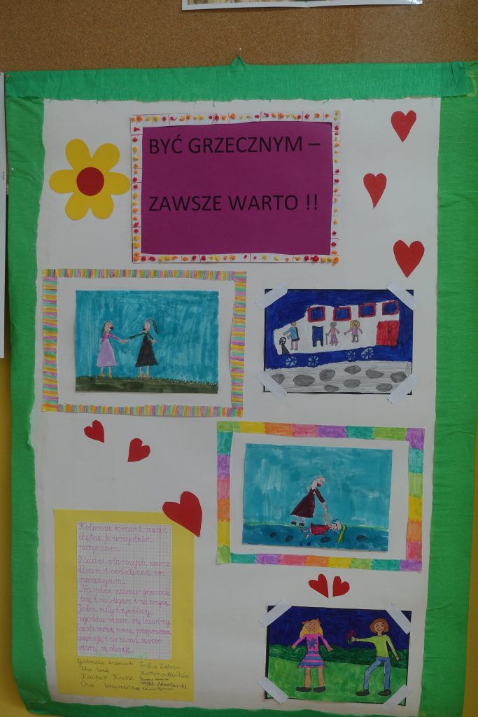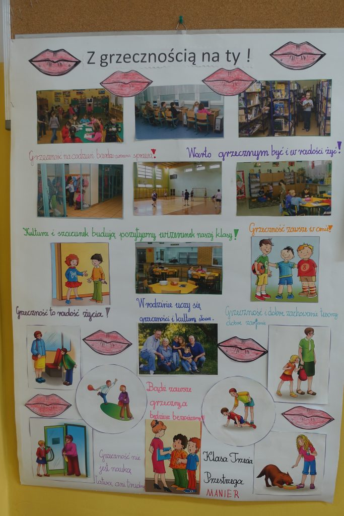Od marca w naszej szkole realizowany jest projekt edukacyjny „Obowiązkowo-grzecznie i zdrowo”, którego celem jest propagowanie zasad kulturalnego zachowania w sytuacjach dnia codziennego, budzenie szacunku do języka polskiego oraz promowanie zasad zdrowego stylu życia. W ramach tego projektu wszystkie klasy przygotowywały plakat o grzeczności. Uczniowie w sposób pomysłowy, twórczy i różnorodny zinterpretowali zaproponowany im temat. Gratulujemy pomysłów.