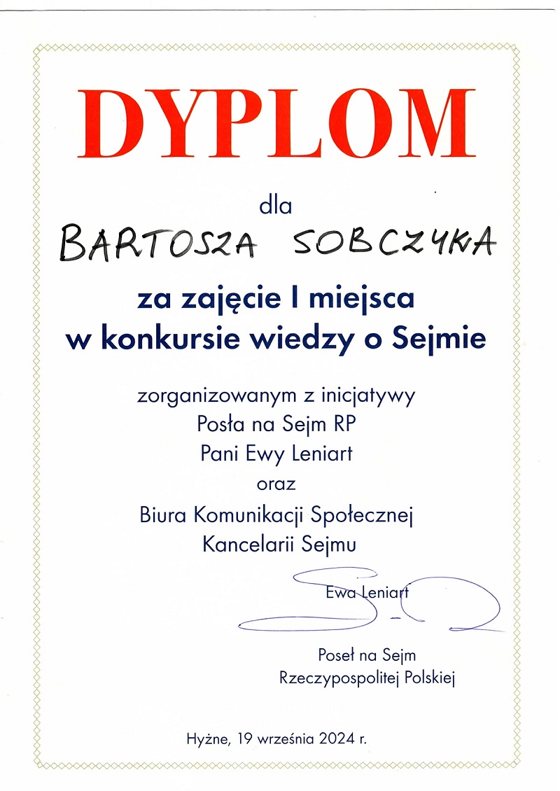 I miejsce naszego ucznia w Konkursie Wiedzy o Sejmie RP