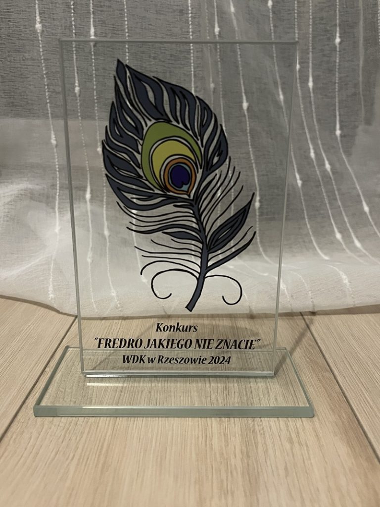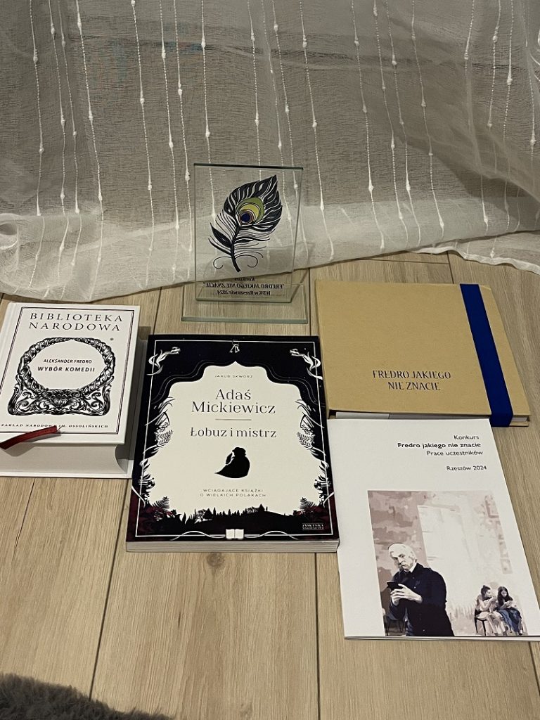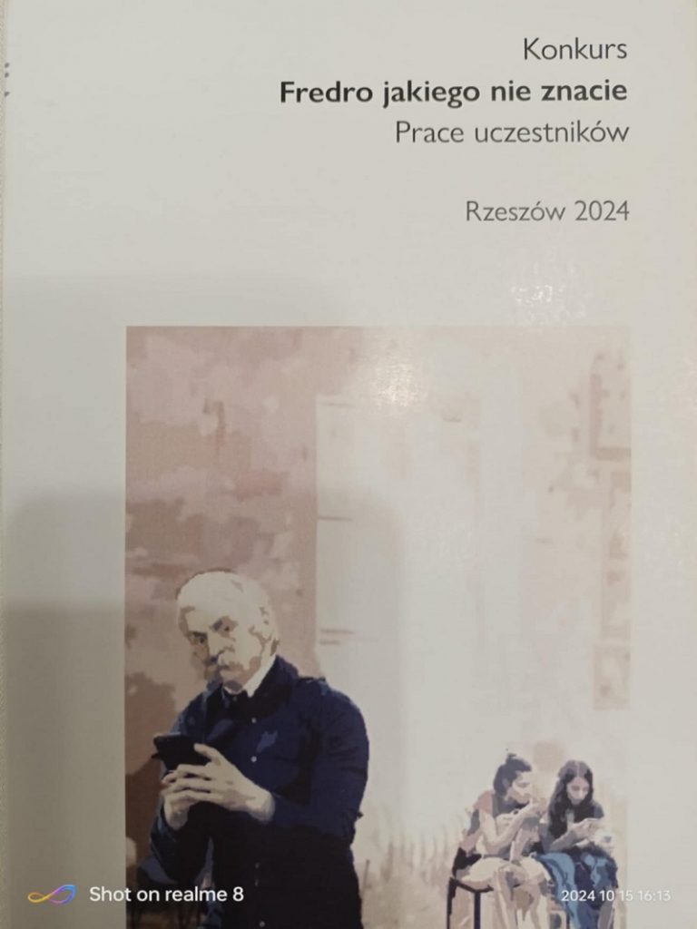 Uczennice naszej szkoły, Oliwia Krowiak i Paulina Majchrowska wzięły udział w literackim  konkursie o zasięgu wojewódzkim, który odbył się w ramach  programu „Ojczysty — dodaj do ulubionych. Edycja 2024”. Uczestnicy mieli za zadanie stworzyć własne fraszki i limeryki inspirowane dziełami Fredry. Głównym i przewodnim celem konkursu było zetknięcie uczniów szkoły podstawowej z językiem polskim, którym w swej twórczości posługiwał się Aleksander Fredro oraz zwrócenie uwagi na przemiany, jakie zachodzą wraz z ewolucją i zmianami językowymi na przestrzeni lat.  Ponadto uczniowie mieli okazję lepiej poznać utwory słynnego komediopisarza urodzonego na Podkarpaciu. Dodatkowo, w kategorii „Akcja trawestacja”, młodzi twórcy mieli za zadanie przełożyć fragmenty utworów Fredry na język współczesny, młodzieżowy. Gala finałowa konkursu „Fredro jakiego nie znacie” odbyła się w Wojewódzkim Domu Kultury, a wydarzenie miało być źródłem inspiracji dla młodego pokolenia. Może dzięki takiej inicjatywie, klasyczna literatura zyska nowe, współczesne oblicze, a młodzież będzie mieć szansę w kreatywny sposób rozwijać swoje kompetencje i umiejętności językowe. Szczególna niespodzianką dla uczestników było pokonkursowe wydanie ich utworów w tomiku poezji . Na zakończenie spotkana wszyscy zostali obdarowani pamiątkowymi nagrodami.