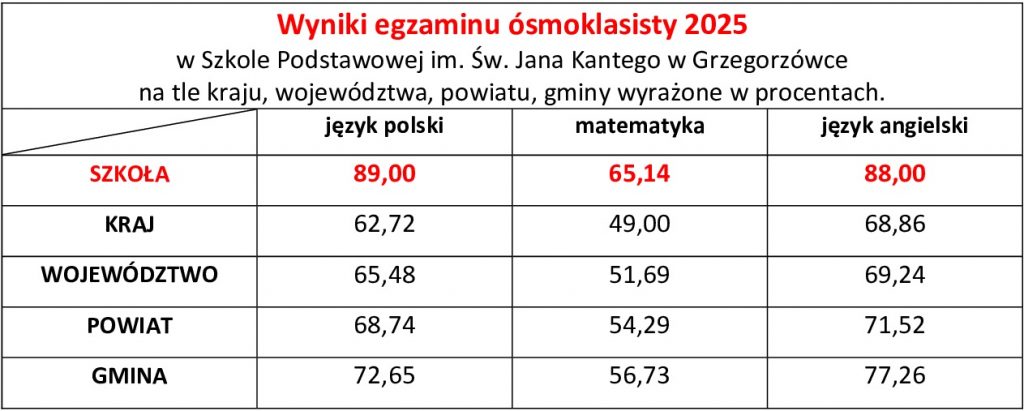 Rok szkolny 2024/2025 był rokiem pełnym wyzwań, wśród których dominowało przygotowanie naszych uczniów do egzaminu ósmoklasisty. Bardzo miło nam poinformować, że zarówno uczniowie jak i nauczyciele Szkoły Podstawowej im. Św. Jana Kantego w Grzegorzówce wykazali się niezwykłą pracowitością i wspólnie osiągnęli bardzo duży sukces egzaminacyjny.