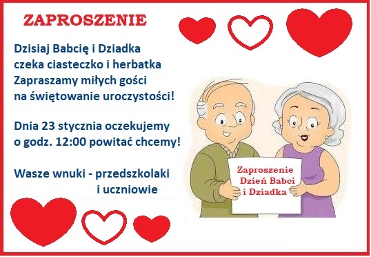 Aktualności 16 stycznia 2026 przez Grzegorz Jeziorski · Published 16 stycznia 2026 Zaproszenie na Uroczystość z okazji Dnia Babci i Dziadka